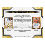Experience the pinnacle of baseball card excellence with the 2023 Topps Five Star Baseball Hobby Box. Unleash the thrill of autograph relic cards, unique parallels, and rare inserts, featuring on-card autographs of the most talented MLB players.