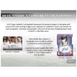 The 2023 Topps Stadium Club Baseball Hobby Compact Box is a visual feast, capturing the essence of baseball’s greatest players through stunning imagery. With the potential for on-card autographs, rare base card parallels, and intriguing inserts featuring MLB® stars, this box is a must-have for enthusiasts seeking the most coveted 2023 rookies, modern stars, and MLB® legends.