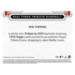 – Look for rare Tribute to 1954 buybacks featuring 1954 Topps cards inserted in an exclusive Topps Tribute frame, dropping in select Hobby boxes.