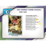 The 2024 Bowman Chrome Baseball Hobby Case delivers an extraordinary opportunity for collectors to dive deep into the world of baseball’s top prospects and emerging stars. This case offers a total of 12 hobby boxes, each packed with Bowman’s iconic Chrome cards, including an array of stunning refractors, autographs, and rare parallels. Known for its prospect-heavy checklist, Bowman Chrome is the go-to product for collectors looking to invest in the future of the game. With a mix of established MLB stars and up-and-coming talent, this 12-box case is a must-have for serious collectors and investors alike.