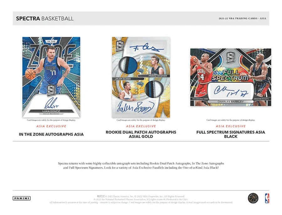 2021-22 Panini Spectra NBA Basketball TMALL delivers (3) EXCLUSIVE Parallels and (1) Additional EXCLUSIVE Parallels or Autographed Card in Every Box! One of the most popular opti-chrome products of the year, Spectra, returns to deliver popular card sets and parallels loaded with autograph content! Configuration: 20 boxes/1 pack/6 cards 2021-22 Panini Spectra NBA Basketball TMALL PRODUCT HIGHLIGHTS: Collect the top rookies from the 2021 NBA Draft in Rookie Jersey Autographs! Look for Asia Exclusive Parallels of Jersey Autographs randomly inserted in Asia boxes! Spectra returns with some highly collectible autograph sets including Rookie Dual Patch Autographs, In The Zone Autographs and Full Spectrum Signatures. Look for a variety of Asia Exclusive Parallels including the One-of-a-Kind Asia Black! Spectra Asia has no shortfall of Parallel content! Chase a wide variety of Asia Exclusive Parallels from top players including Rookies, Veterans and Retired players in Base and a variety of subsets! Find several Asia Exclusive Parallels of Rookie Jersey Autographs from top rookies including Cade Cunningham, Jalen Green, Evan Mobley and more! Look for Asia, Asia Gold and Asia Black (One-of-One) Parallels!